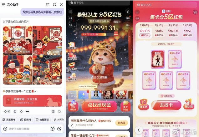 百度APP投入5亿现金红包并亮相北京台春晚,腾讯元宝推出10亿红包活动,火山引擎与豆包则成为央视春晚的AI合作伙伴。