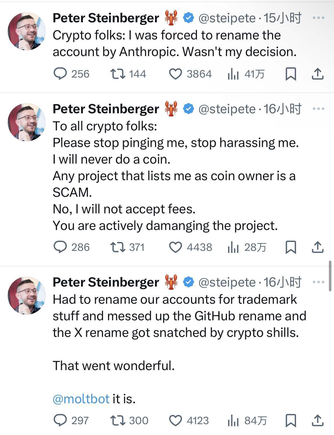 他透露,这次改名源于商标问题,但在操作过程中不仅搞砸了 GitHub 的账号更名,连 X 平台的原账号名也被加密货币推广者抢注了。最终,他的新账号名定为@moltbot。