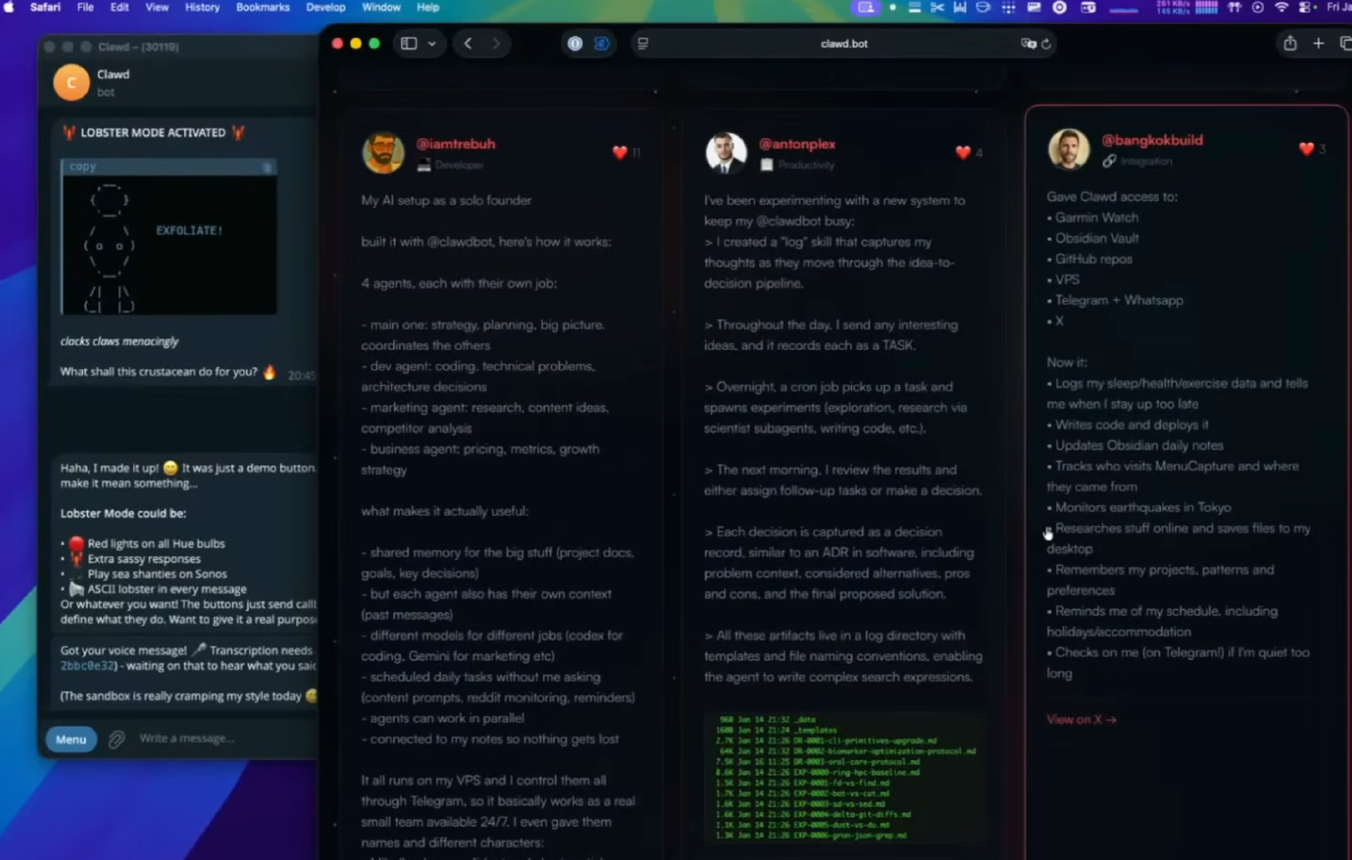 还有人用它做各种自动化,比如在 Twitter 上收藏一条内容,它就自动研究、整理进 to do list;有人直接拿它搭完整应用;几乎人人都给它配一台 MacBook。我以前的一个合伙人,甚至让它清空了收件箱里的一万封邮件。