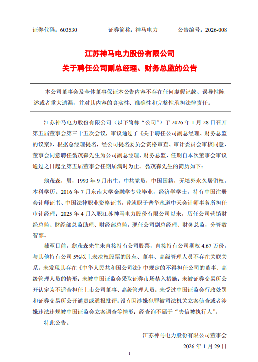 神马电力(603530)公告称,公司于2026年1月28日召开第五届董事会第三十五次会议,审议通过了《关于聘任公司副总经理、财务总监的议案》,根据总经理提名,经公司提名委员会资格审查、审计委员会审核同意,董事会同意聘任翁茂森先生为公司副总经理、财务总监,任期自本次董事会审议通过之日起至第五届董事会任期届满时为止。