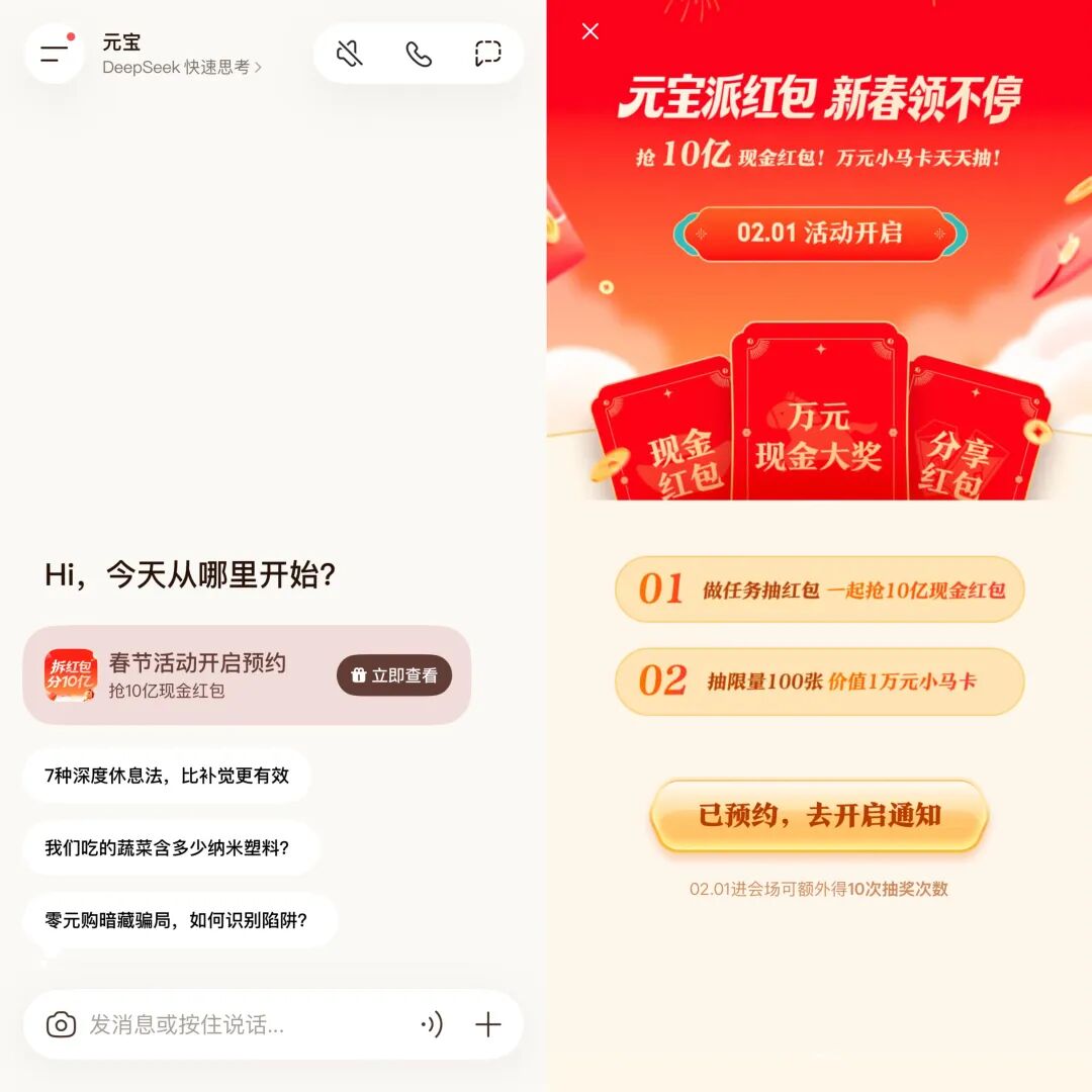 1 月 26 日,腾讯直接扔下两颗王炸:元宝 APP 春节怒砸 10 亿现金红包狂撒币,同时内测社交新功能“元宝派”,界面明目张胆对标微信。