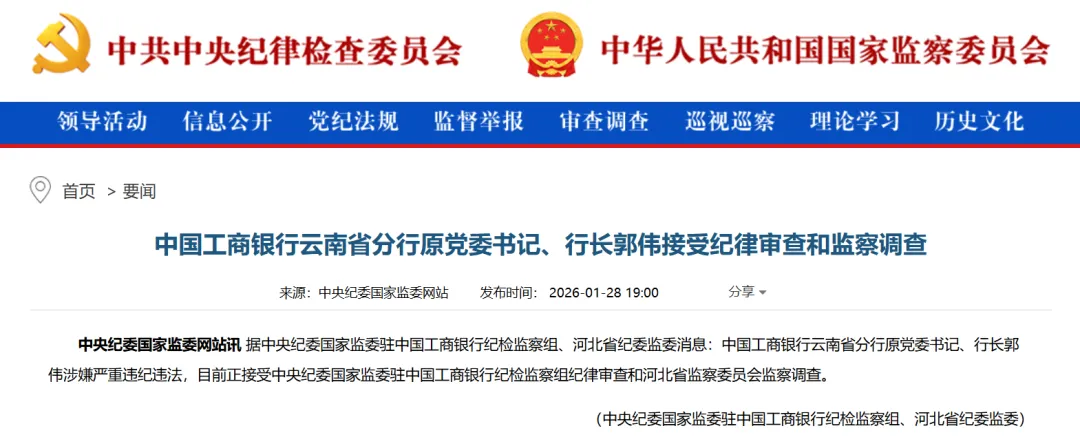 2026年1月28日,中央纪委国家监委官网通报称,中国工商银行云南省分行原党委书记、行长郭伟涉嫌严重违纪违法,目前正接受中央纪委国家监委驻中国工商银行纪检监察组纪律审查和河北省监察委员会监察调查。