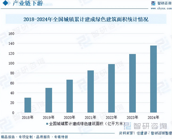 根据《绿色建筑评价标准》GB/T50378-2019,绿色建筑是指在全寿命期内,节约资源、保护环境、减少污染,为人们提供健康、适用、高效的使用空间,最大限度地实现人与自然和谐共生的高质量建筑。绿色建筑按等级划分为基本级、一星级、二星级、三星级四个等级。当满足全部控制项要求时,绿色建筑等级应为基本级。随着环保意识的不断提高,绿色建筑行业逐渐成为全球建筑行业的发展趋势。近年来,我国大力推广绿色建筑。截至2024年底,全国城镇累计建成绿色建筑面积135.4亿平方米,其中,2024年城镇新建绿色建筑面积16.9亿平方米,占当年城镇新建建筑面积的97.9%。未来,绿色建筑的规模化将衍生出巨大的优质融资需求,为绿色信贷开辟广阔而稳定的资产市场,并深度赋能绿色金融体系的扩张。