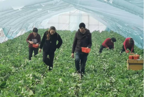 游客与务工人员在家庭农场采摘新鲜草莓