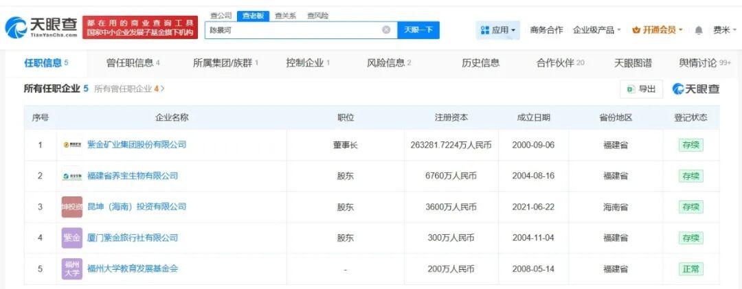 信息显示,陈景河名下关联5家存续企业,包括紫金矿业集团股份有限公司、福建省养宝生物有限公司、福州大学教育发展基金会等,陈景河在上述公司担任理事或者持有股份。