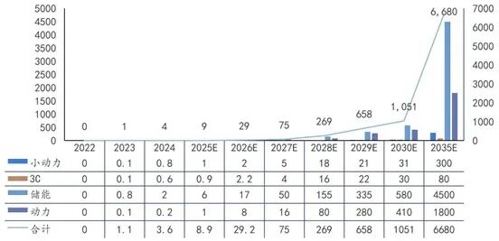 图 2022~2035 年全球钠离子电池市场规模及预测(GWh/年)
