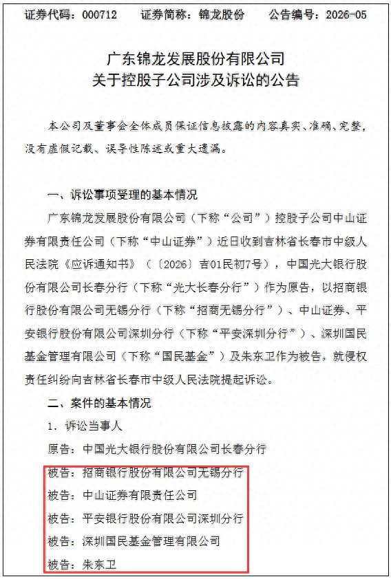 日前,中山证券第一大股东锦龙股份披露,中山证券卷入一桩涉案金额近4.9亿元的侵权责任纠纷,原告光大银行长春分行将招商银行无锡分行、平安银行深圳分行等五家机构告上法庭。