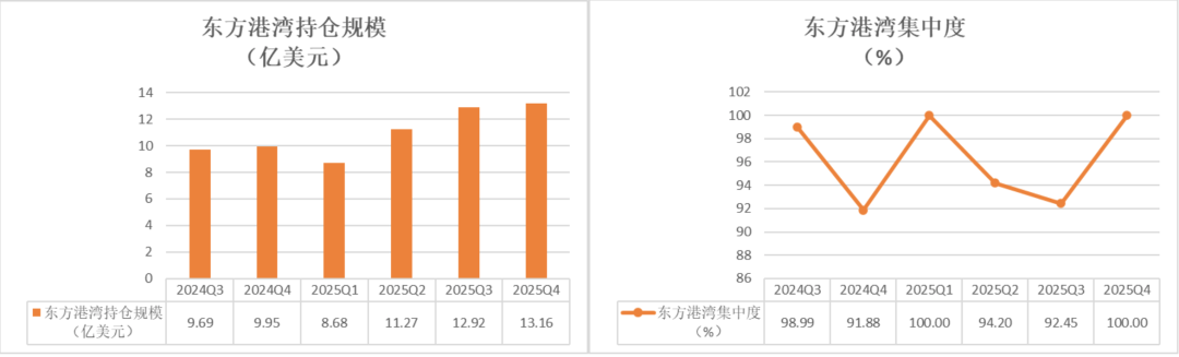 报告显示,东方港湾四季度末持仓规模达到13.16亿美元,约合人民币91.43亿元,