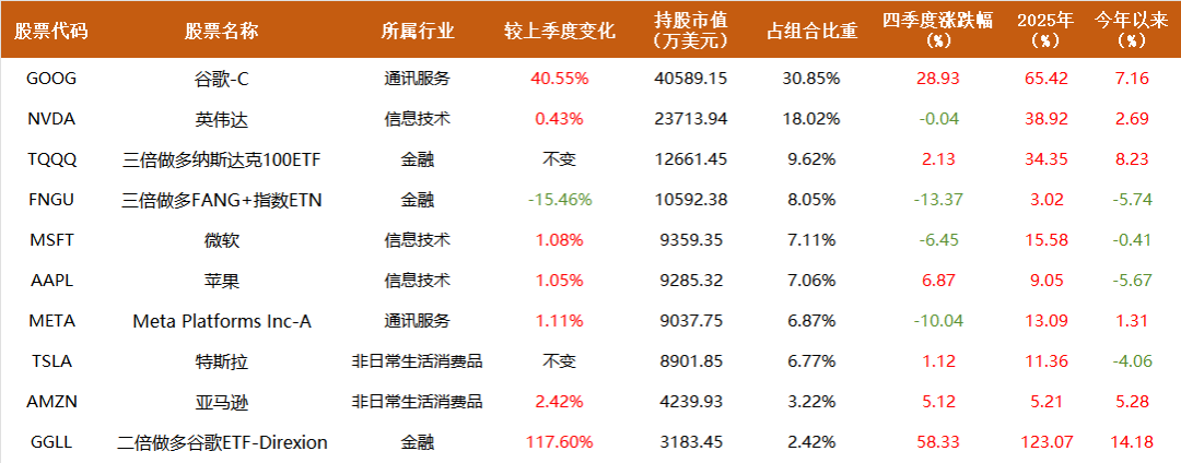 仅前两大持股谷歌和英伟达的权重合计就高达48.87%,较上季度有大幅提升。