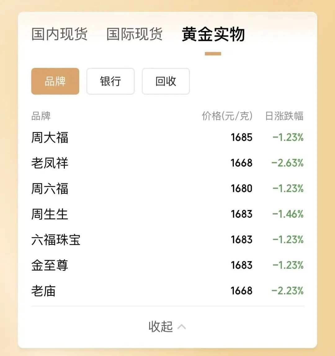 记者还注意到,受金价波动影响,各大门店的成品金饰价格,今日也纷纷回落。周大福、老凤祥、周六福、周生生等一众品牌,今日成品金饰价格均跌破1700元/克。