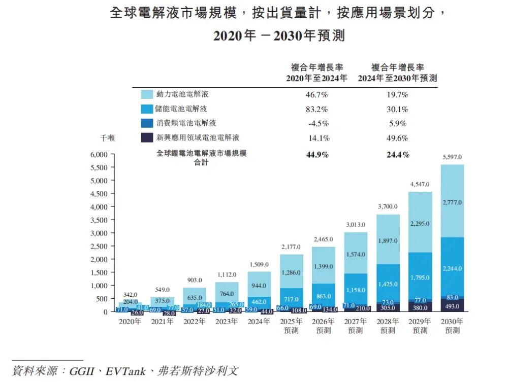 根据弗若斯特沙利文(Frost & Sullivan)的报告,2020年,全球电解液出货量约为34.2万吨,至2024年增长至约150.9万吨,2020年至2024年间复合年增长率为44.9%。预计2030年出货量有望达到559.7万吨,2024年至2030年间复合年增长率预计为24.4%。