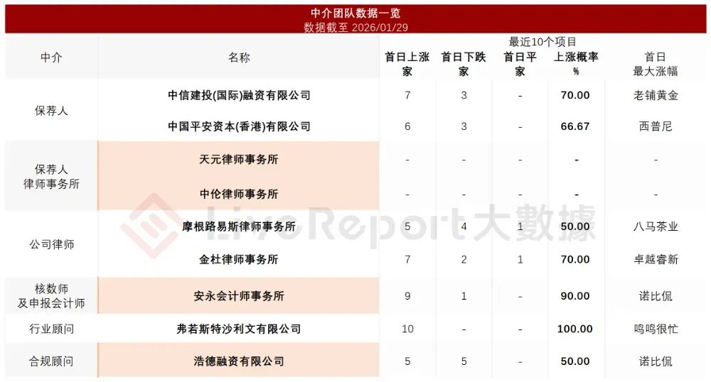 据LiveReport大数据统计,昆仑股份中介团队共计9家,其中保荐人2家,近10家保荐项目数据表现普通;公司律师共计2家,综合项目数据表现有待提升。整体而言中介团队历史数据表现中规中矩。