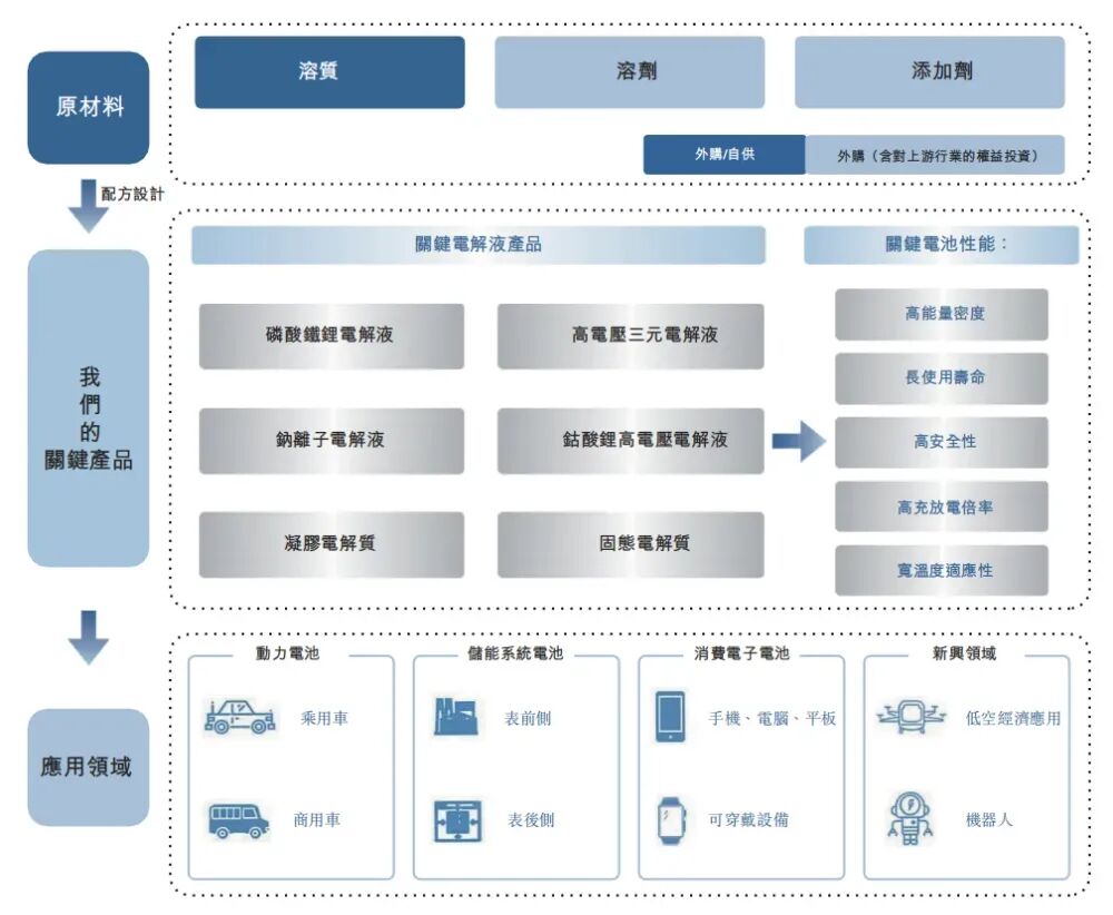 公司开发了全面的产品组合,涵盖动力电池、储能系统电池、消费电子电池及新兴应用的电解液。