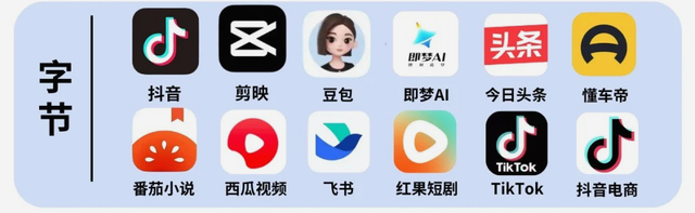 大众熟知的豆包、汽水音乐、番茄小说、西瓜视频、红果短剧、懂车帝等均出自字节跳动。