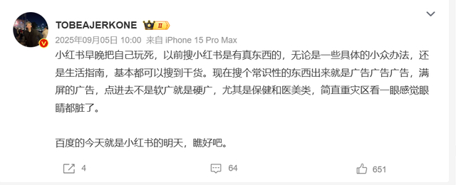 甚至还有人称百度的今天就是小红书的明天,其表示以前搜小红书是有真东西的,无论是一些具体的小众办法,还是生活指南,基本都可以搜到干货。现在搜个常识性的东西出来就是广告广告广告,满屏的广告,点进去不是软广就是硬广,尤其是保健和医美类,简直重灾区看一眼感觉眼睛都脏了。