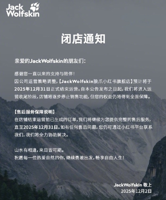 譬如知名户外品牌狼爪曾发布闭店通知,宣布因公司运营策略调整,其小红书旗舰店预计于2025年12月31日正式结束运营。