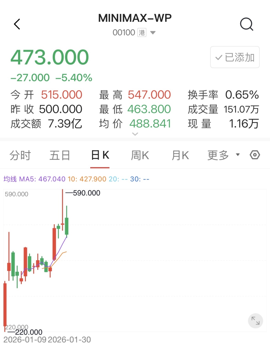 1月30日,MiniMax开盘515港元,盘中最高冲至547港元,但随后大幅回落,最终收盘报473港元,单日下跌5.40%。而就在前一日,受新品发布利好影响,MiniMax盘中创下590港元的历史最高价,市值一度突破1800亿港元。
