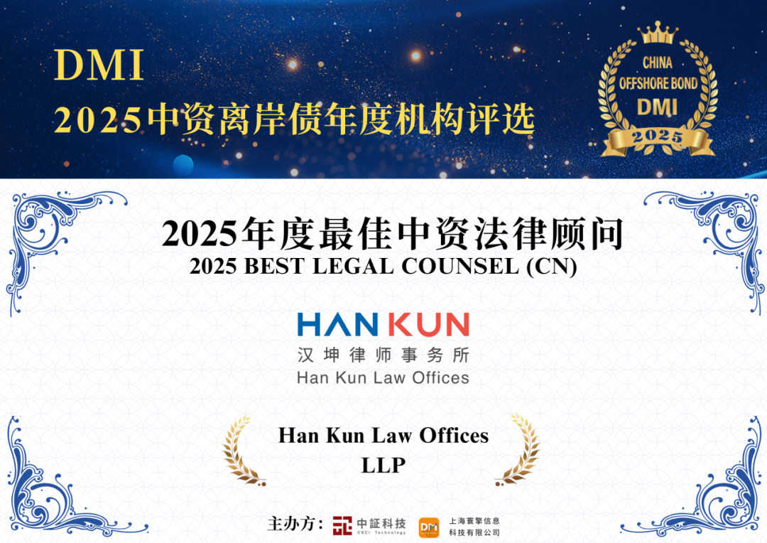 2026年2月2日,中证信用科技有限公司(简称“中证科技DMI”)正式揭晓其2025年“DMI中资离岸债年度机构评选”结果。凭借过去一年在离岸债券法律服务领域的卓越表现与突出业绩,汉坤荣获“年度最佳中资法律顾问”机构奖项,同时参与的三项交易分别荣获“年度最佳投资级交易”与“年度最佳点心债交易”。