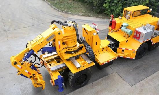 煤矿井下混凝土喷浆作业量大,实际施工中主要是人工作业,对人工的需求较大、工人劳动强度高、工作效率较低。喷浆机器人由底盘系统、液压系统、电气系统以及工作系统组成,采用湿式喷浆工艺,集自行走、混凝土泵送、机械臂喷射、远程遥控等技术于一体,通过遥控远程操作实现电机启停、泵送启停、泵送快慢、软管泵快慢、大臂动作、底盘行走等功能。核心优势为“精准建模+智能喷射”,提升质量与材料利用率。应用数据显示,传统3~4人单班作业量,机器人1~2人遥控操作即可完成,效率提升2倍。远程操控使作业人员远离高粉尘作业环境,规避矽肺病风险,喷浆机器人如图10所示。