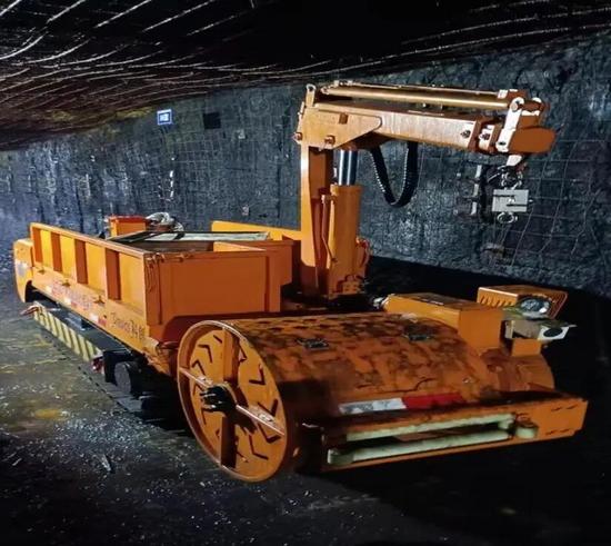 煤矿井下材料运输过程中的装卸工作,巷道狭窄区域的物料搬运,主要靠人工完成,劳动强度大并存在安全隐患。履带输送机器人采用高转矩液压驱履带结构,具备30°爬坡、15 cm越障能力,单机载重3 t,集成装载、运输、卸载一体化功能。应用于大柳塔煤矿掘进工作面设备备件与支护材料运输,机器人运输效率提升4倍,减员率60%,适配多种物料狭窄巷道运输需求,1人操作即可完成,物料运输过程全程可控,实现安全运输,履带输送机器人如图5所示。