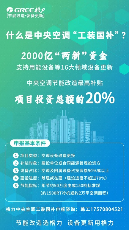 为推动节能降碳和设备更新,国家安排超长期特别国债2000亿元支持大规模设备更新,明确了“用能设备(含中央空调)”等16个方向的更新改造项目采取投资补助方式予以支持,推动建筑领域节能降碳和绿色焕新。“中央空调节能改造最高可获得投资总额20%的补贴!(含安装工程)”