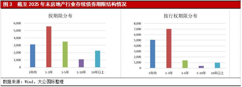 从存续债分布来看,未来3年内行业整体仍处于偿债高峰。截至2025年末,房地产行业信用债存续规模为15,555.23亿元。按期限分布来看,未来3年内仍为到期偿付高峰期,债务偿还压力以及债务置换需求均较大,其中,未来1年内到期债务规模为3,128.83亿元,若考虑行权,则到期规模为5,085.74亿元,需关注到期债务较为集中、流动性紧张的房企新发债券置换及兑付情况。