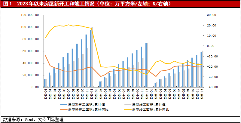 2025年,房地产开发投资加速探底,新开工规模深度收缩。2025年,在全年行业严控增量,优化存量的整体基调下,全国房地产开发投资完成82,788亿元,同比下降17.20%,降幅较往年进一步扩大,开发投资加速探底;全年房地产新开工面积58,770万平方米,同比下降20.40%,降幅仍然较大,且全年新开工面积仍远低于全年商品房销售面积;随着保交楼工作的不断推进,全年累计竣工面积为60,348万平方米,同比下降18.10%,降幅较去年同期收窄9.6个百分点。