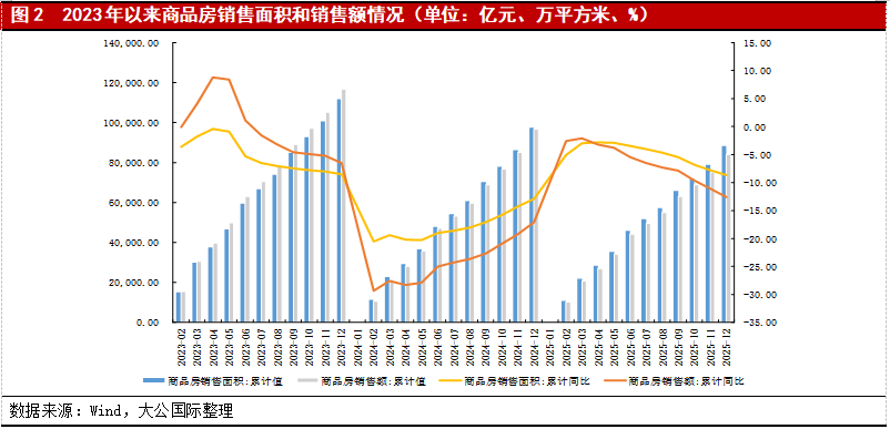 2025年商品房销售持续筑底,但降幅收窄呈止跌回稳态势。2025年全年,全国商品房销售额83,937亿元,同比下降12.60%,销售面积88,101万平方米,同比下降8.7%,降幅达全年最高,销售持续筑底,但降幅相较2024年全年分别收窄4.5个百分点和4.2个百分点,全年来看2025年商品房销售整体呈止跌回稳态势。