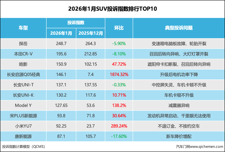 2026年1月SUV投诉指数排行:合资车型包揽前三