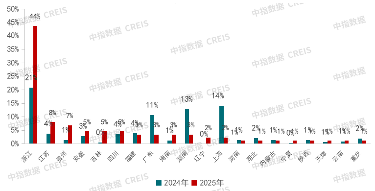 2025年,通过对全国房地产招标数据监测分析,从发布数量来看,同比减少79.4%;从发布区域来看,浙江省信息发布条数最高,占比为44%,浙江省占比较高主要由于部分省份大幅减少代建类业务招标。从增速来看,2025年,除浙江省外,江苏、贵州、安徽、吉林、海南、辽宁等省招标数量增速均较快;广东、湖南、上海等省市占比有所下降。