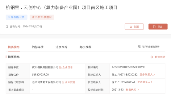 2月3日,杭州钢铁集团有限公司发布《杭钢里·云创中心(算力装备产业园)项目南区施工项目》招标公告,预算为56930.9239 万元。
