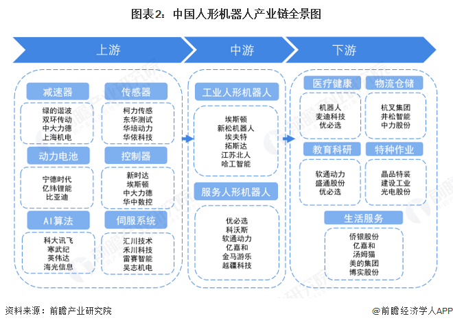 从人形机器人产业链参与企业来看,上游环节减速器主要有绿地谐波、双环传动等,传感器有柯力传感、东华测试等,宁德时代和比亚迪等企业提供动力电池,新时达、埃斯顿等企业生产控制器,伺服系统由汇川技术、禾川科技等企业提供,AI算法领域主要有科大讯飞、寒武纪等;中游工业人形机器人生产企业主要有埃斯顿、新松机器人、埃夫特等,覆盖汽车制造等工业场景,服务人形机器人主要有优必选、科沃斯、软通动力等企业,覆盖商用、家庭、教育等多场景;下游医疗健康领域应用主要有机器人、麦迪科技、优必选,物流仓储有杭叉集团、井松智能等,教育科研主要有软通动力、盛通股份等,特种作业主要有晶品特装、建设工业等,生活服务场景主要有侨银股份、亿嘉和、汤姆猫等企业。