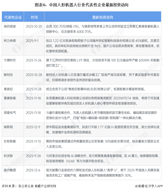 2025年下半年,绿的谐波、美的集团等企业聚焦人形机器人、具身智能、新能源等核心领域,通过合资设立创新中心、股权收购、产能建设、AI战略合作等方式,加速技术落地与全球化拓展。以下是中国人形机器人行业代表性企业最新投资动向整理: