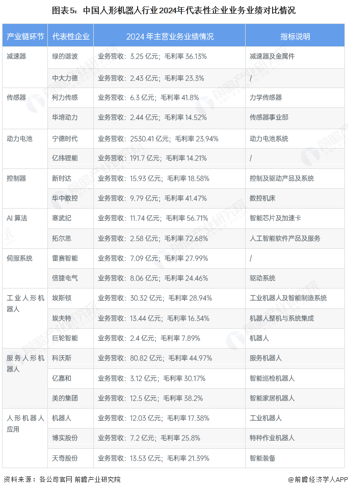 根据各企业发布的2024年报数据统计,机器人产业链上游核心部件类企业中,宁德时代的动力电池业务营收超2500亿元,AI算法类企业毛利率较高,其中拓尔思高达72.68%;工业和服务人形机器人及应用类企业营收从数亿到数十亿元不等,各环节盈利水平随业务属性呈现明显分化。