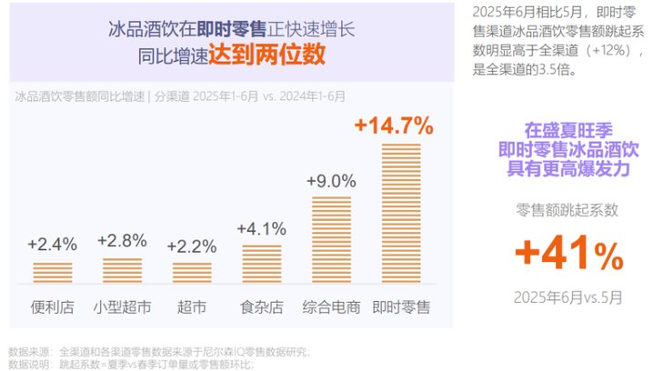 这一背景下,以美团闪购和淘宝闪购为代表的即时零售平台,正在把“买饮料”的核心场景,从门店货架,迁移到前置仓与分钟级履约网络之中。尼尔森IQ与淘宝闪购联合发布的报告显示,2025年6月,冰品酒饮在即时零售渠道的零售额环比增长41%,是全渠道增速的3.5倍。