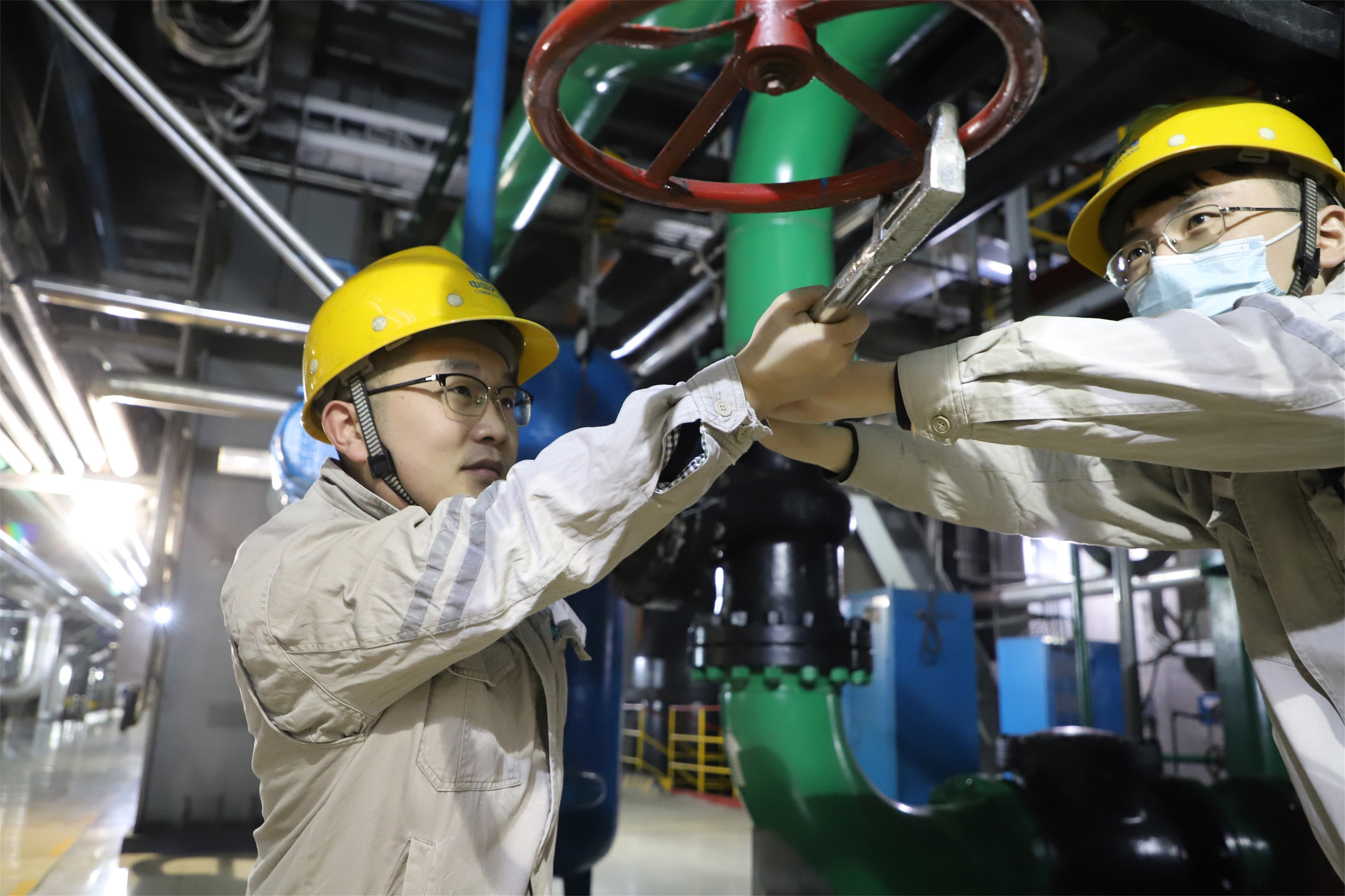 内蒙古大唐国际托克托发电有限责任公司发电部集控运行值班员刘成成(左一)在进行就地操作,确保机组稳定运行。