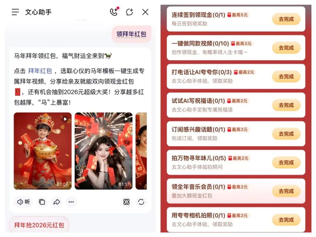 在大家都把红包密集砸向APP,期望靠春节大举拉新时,有一家大厂却有点不同。今年春节,百度选择把红包主场放进了月活超7亿的百度App里的文心助手——不用专门下个新应用,也不用在几个软件之间反复横跳。这种“无痛”体验,就是回归了互联网最朴素的本分:少打扰用户,才是好体验。