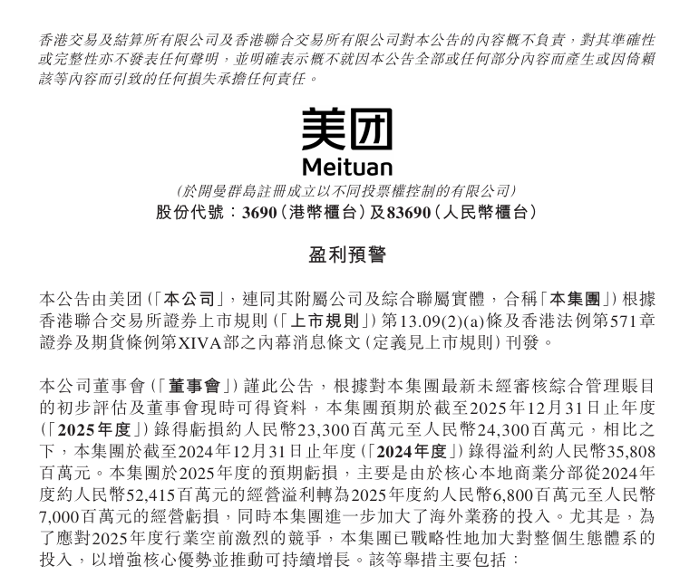 2月13日,美团(03690.HK)在香港交易所发布盈利预警公告,预期2025年度将录得人民币233亿元至243亿元的亏损,与2024年度人民币358.08亿元的溢利形成鲜明反差,业绩出现大幅反转。公告明确了亏损核心成因,并披露2026年一季度亏损趋势将延续,但公司经营稳健、现金储备充足,足以支撑业务持续发展。