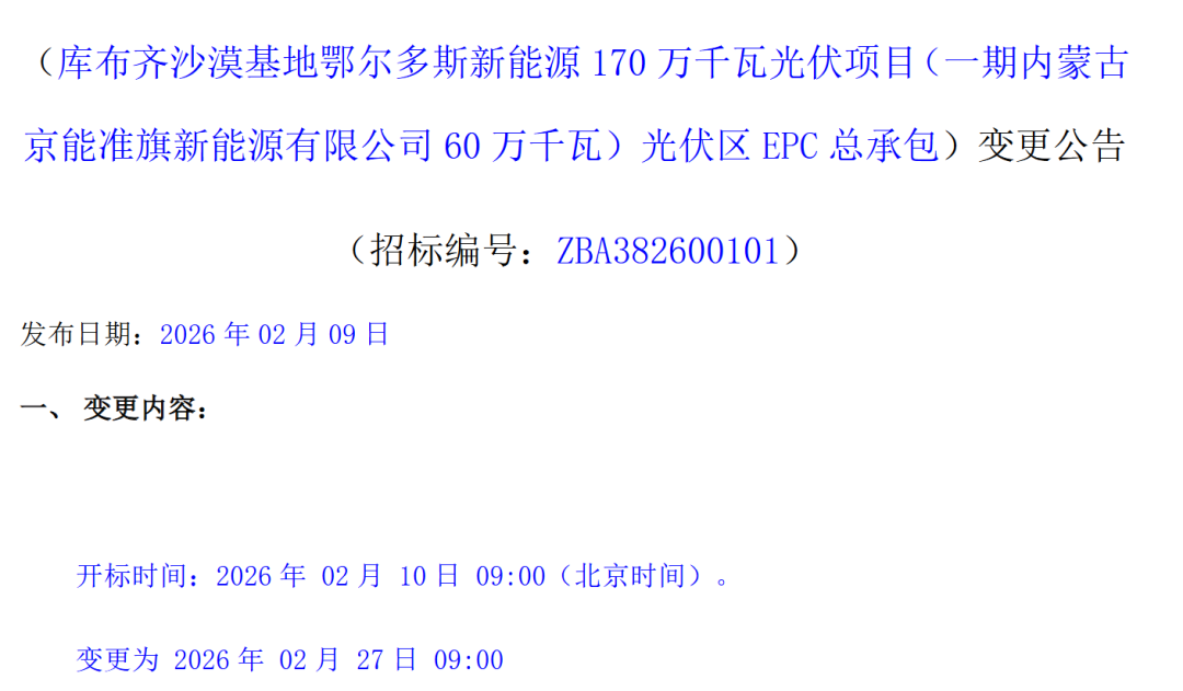 2月9日,库布齐沙漠基地鄂尔多斯新能源170万千瓦光伏项目(一期内蒙古京能准旗新能源有限公司60万千瓦)光伏区EPC总承包变更公告发布,开标时间由原来的2026年2月10日9时延期至2026年2月27日9时。