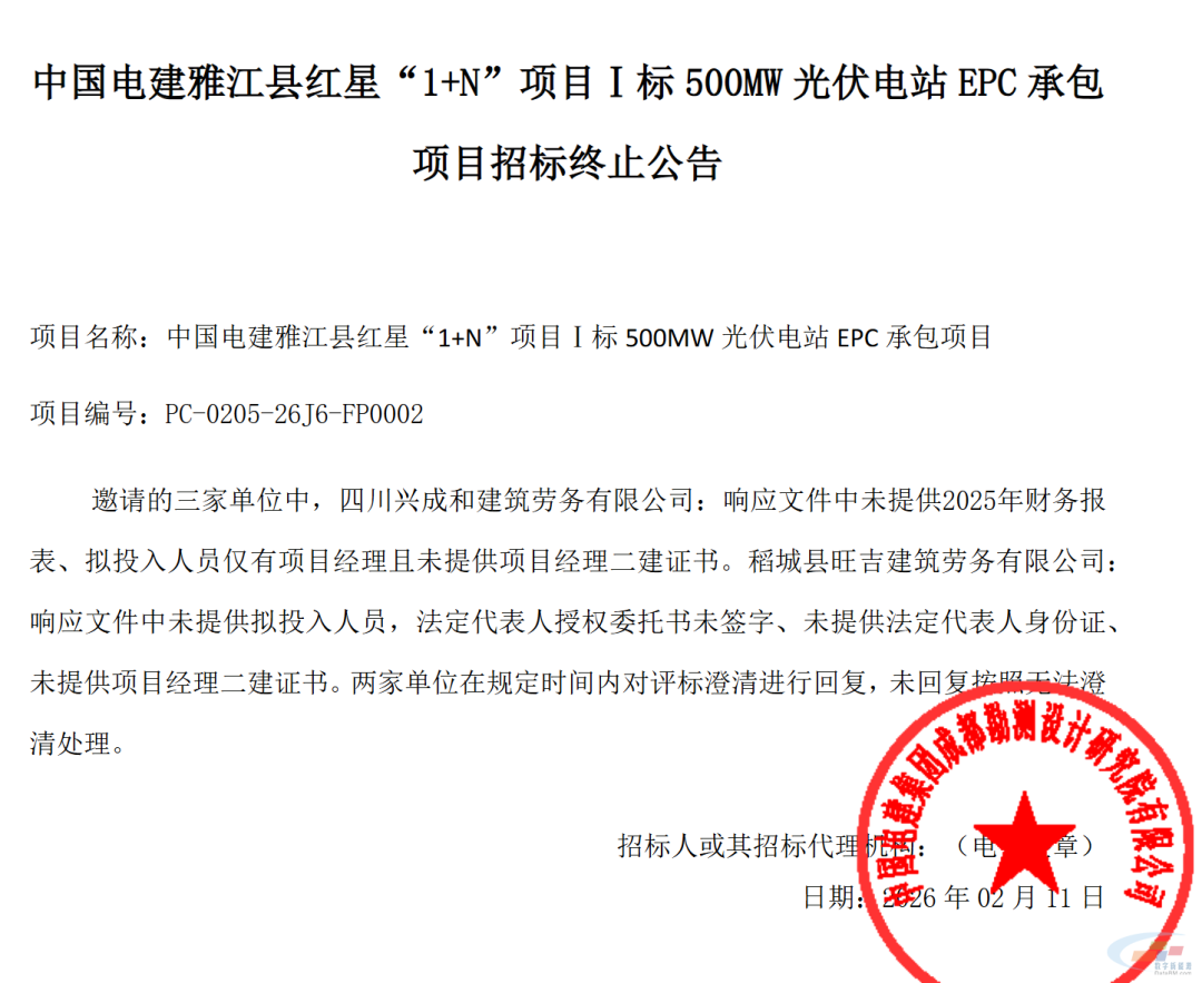 2月11日,中国电建阳光采购网发布中国电建雅江县红星“1+N”项目Ⅰ标 500MW 光伏电站 EPC 承包项目招标终止公告。