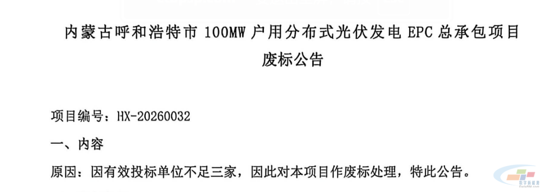 2月10日,内蒙古呼和浩特市100MW户用分布式光伏发电EPC总承包项目发布废标公告。公告显示,废标原因为有效投标单位不足三家。