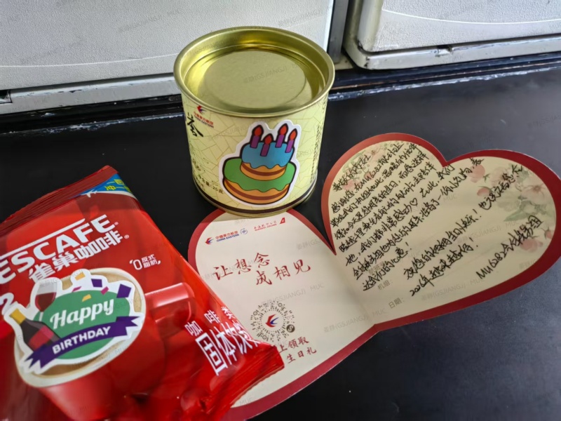 了解到苏女士这份跨越千里的心意后,该航班乘务组全体成员深受感动。为了让这份爱与温暖在旅途中延续,乘务组立即行动起来,她们利用机上可用资源,发挥创意,为苏女士精心准备了一份独一无二的“生日大礼包”。同时,在心意卡上,该航班全体机组人员郑重地写下了对苏妈妈最真挚的生日祝福。