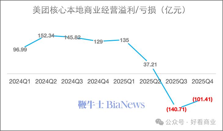 美团及王兴多次公开表达反对低价内卷。从财报数据看,美团在克制烧钱,亏损在收窄。2025年,核心本地商业经营亏损预计68-70亿;Q4亏损99.41-101.41亿元,低于Q3的140.71亿,也低于高盛/中金等预期的亏损110亿-115亿元。