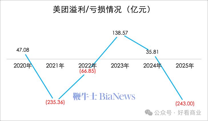 这与2024年录得约358.08亿元溢利形成鲜明对比,等于在利润端出现近600亿元的剧烈反转。美团上一次巨亏是在2021年,当时美团豪赌社区团购等新业务,年亏235.36亿元。