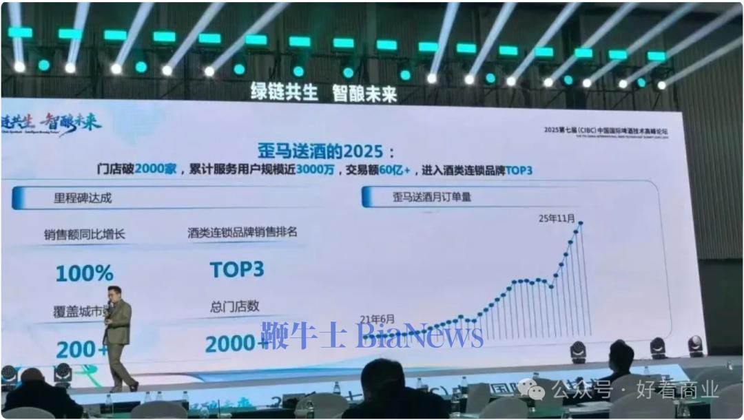 美团的歪马送酒2021年6月正式上线,2025交易额突破60亿元,同比增长100%,服务近3000万用户;目前覆盖超200个城市2000多家门店。四年时间,其门店规模和年销售额在酒类即时零售中跻身TOP3。