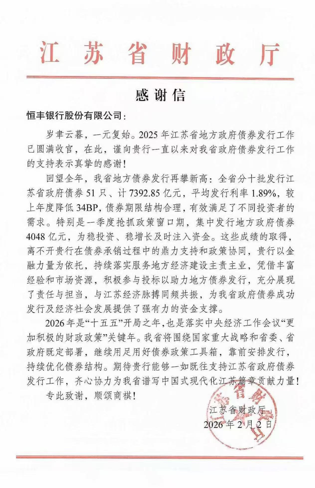 新年伊始,恒丰银行在江苏地方债领域的服务能力再上新台阶,捷报频传。1月中旬,江苏省财政厅正式公布《2026-2028年江苏省政府债券承销团成员名单》,恒丰银行成功入选并荣获副主承销商资质。2月上旬,因2025年在江苏省地方政府债券发行工作中的卓越表现,恒丰银行收到江苏省财政厅发来的感谢信,近年来在区域金融服务中的持续深耕与专业能力获得地方高度认可。