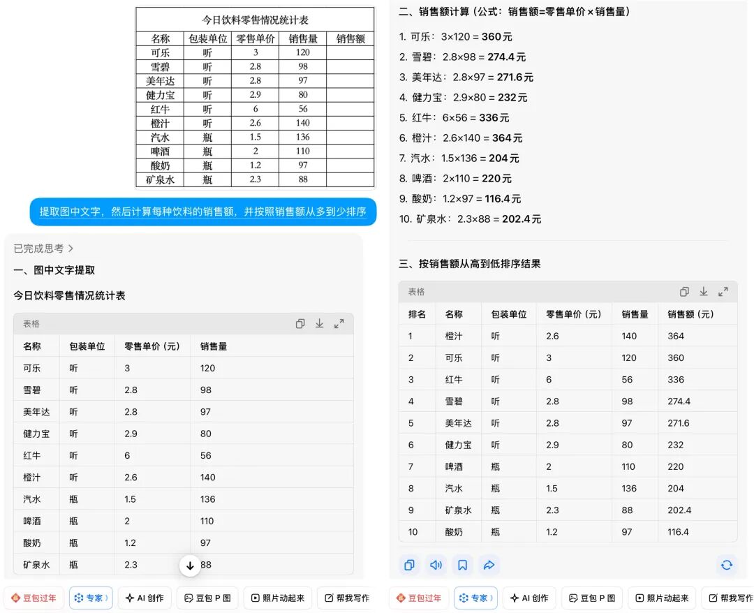 豆包按需调用工具,文字提取丝毫不差,自主理解任务逻辑,准确应用销售额计算公式,最终排完序以结构化表格呈现。