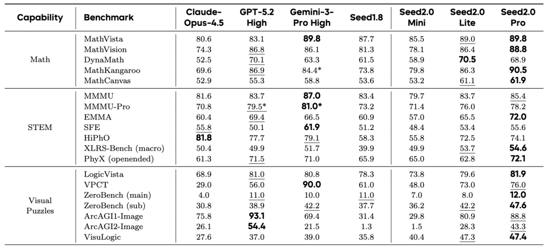 在数学与视觉推理方面,豆包 2.0 Pro 在 MathVista、MathVision、MathKangaroo、MathCanvas 等数学推理基准上达到业界最优水平,在科学领域的整体成绩与 Gemini 3 Pro 和 GPT 5.2 相当。