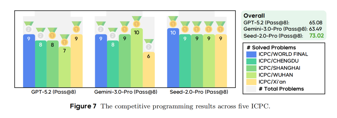 在推理和 Agent 能力评测中,豆包 2.0 Pro 在 IMO、CMO 数学奥赛和 ICPC 编程竞赛中获得金牌成绩,也超越了 Gemini 3 Pro 在 Putnam Bench 上的表现。