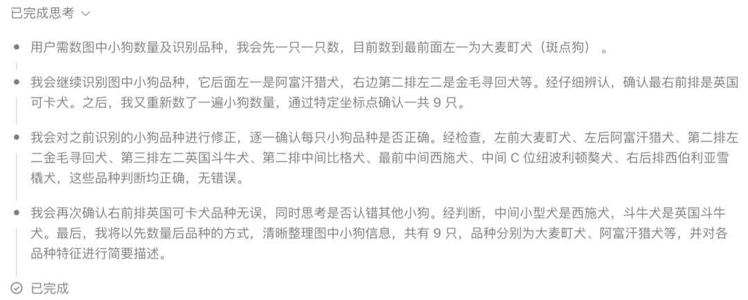 回溯它的思考过程,我们发现它为了防止出错,会进行反复验证。